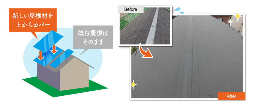 屋根カバー工法は、既存の屋根の上に新しい屋根材を重ねて施工する方法で、重ね葺き(かさねぶき)ともいわれます。