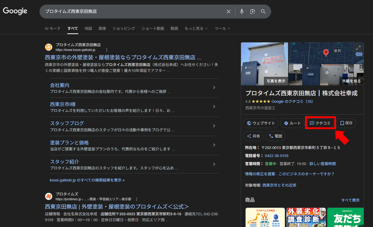 Googleで「プロタイムズ西東京田無店」のようにキーワードを入力して検索すると、検索結果の右側(スマートフォンの場合は上部)に店舗情報が表示されます。