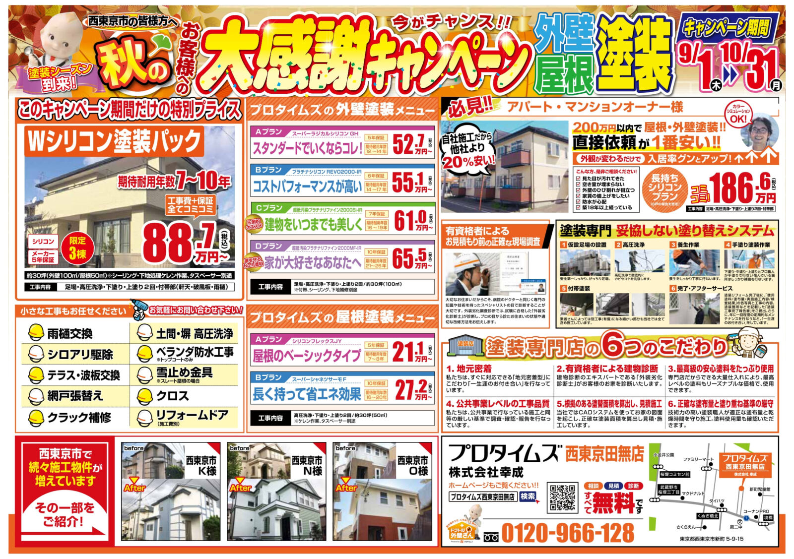 プロタイムズ西東京田無店|株式会社幸成では秋の塗装キャンペーンを開催中です。